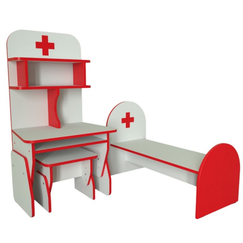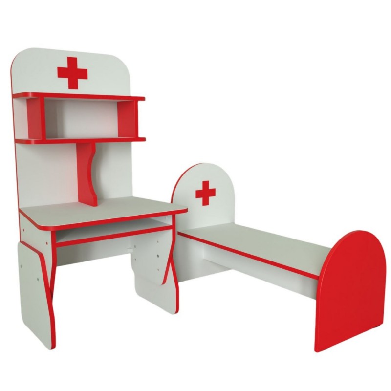 станет помощником в развитии Вашего ребенка с малых лет. Данная игровая мебель предназначена для оснащения детских дошкольных учреждений, а также домашней детской комнаты. Игровой комплект состоит из двух предметов: стола с полочками для медицинских инструментов, препаратов и кушетки для приема пациентов. Играя, дети смогут почувствовать себя в роли врача и пациента, научатся заботится о своих игрушечных друзьях и делать им различные медицинские процедуры. Игровая стенка изготовлена из ламинированного ДСП толщиной 16 мм, торцы облицованы кромкой ПВХ 1 мм.